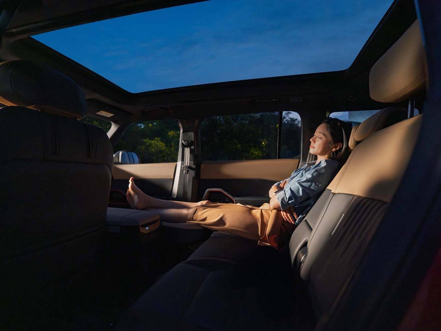 更貼心的是“一鍵成床”設計——無需手動拆卸頭枕、無需騰挪后備箱行李,一、二排座椅可快速拼接為平整臥榻;B柱出風口、C柱充電口與可調節色溫閱讀燈組成“車載床頭柜”,恒溫舒適與充電自由兼得,真正實現“睡在星空里,醒在霞光中”。