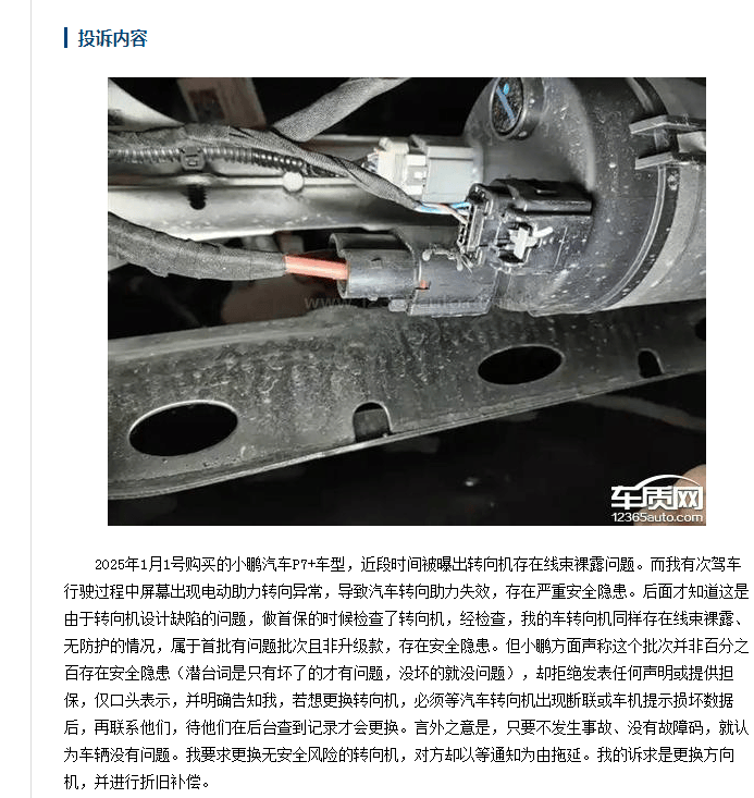 而從車質(zhì)網(wǎng)查詢來看,有關(guān)于小鵬P7+的投訴也層出不窮,主要涉及的都是轉(zhuǎn)向系統(tǒng)問題和轉(zhuǎn)向故障問題,比如有車主就直接指出,是因?yàn)檗D(zhuǎn)向機(jī)存在線束裸露、無防護(hù)的問題,才導(dǎo)致汽車轉(zhuǎn)向助力失效,存在嚴(yán)重安全隱患。