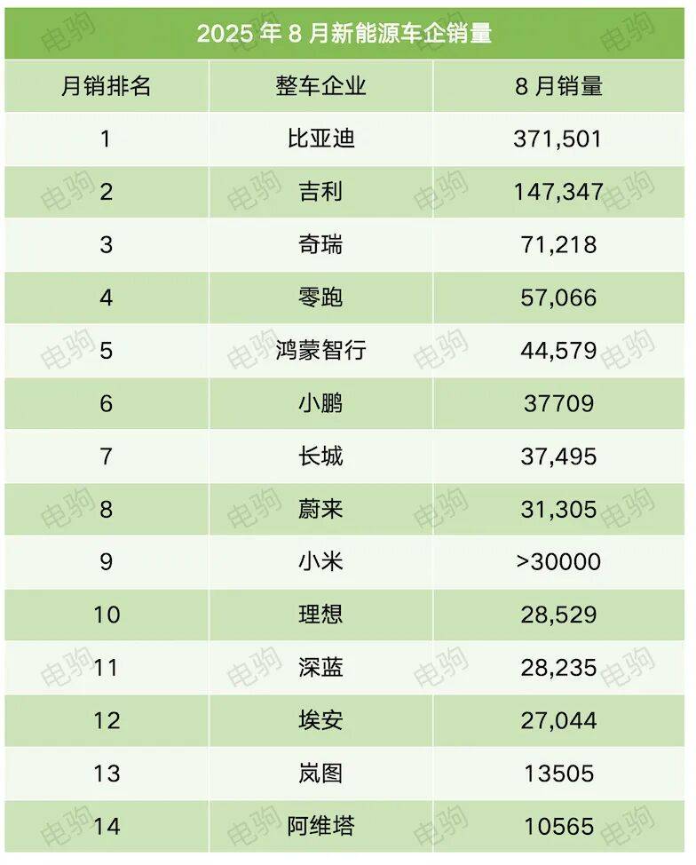 比亞迪新能源乘用車8月以371,501輛的銷量成績繼續穩居榜首,環比增長8.9%,同比增長0.2%;