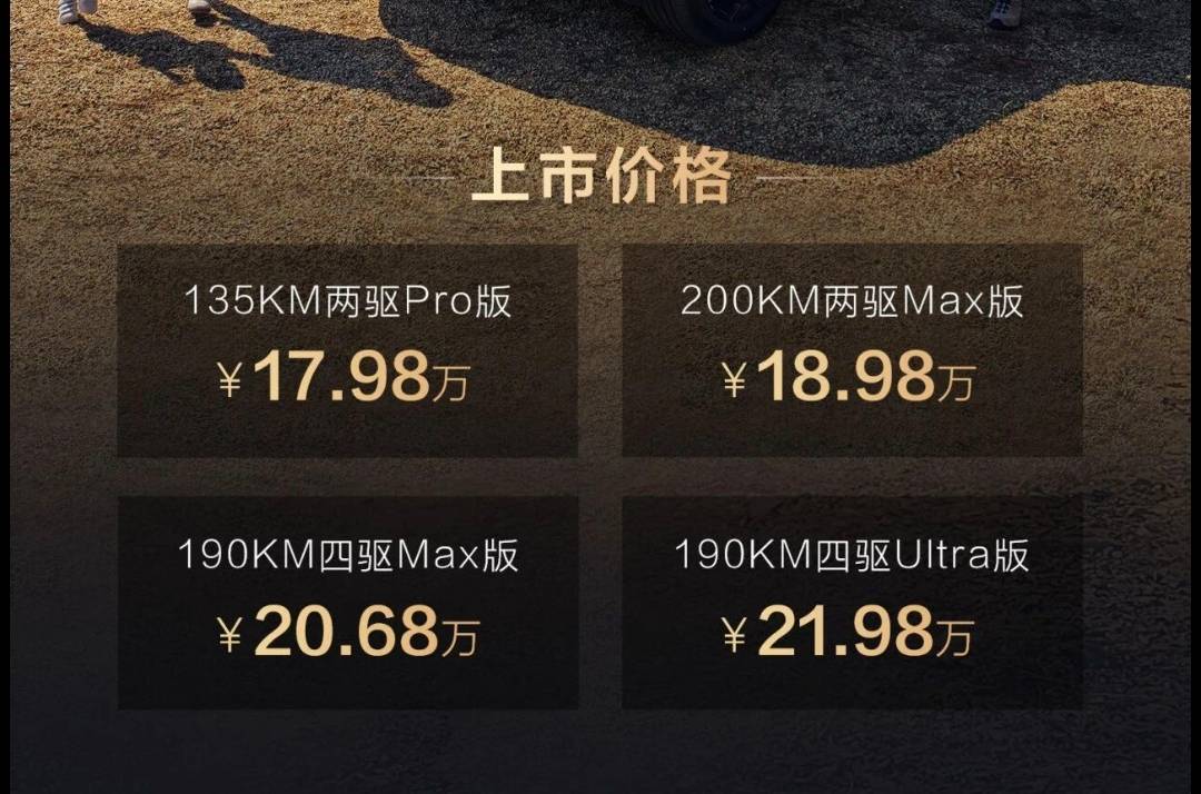 方程豹的宣發動靜著實不大,但是價格還算給力,一口氣推出四款車型,入門版135公里純電續航17.98萬、200km純電續航Max版本18.98萬,190公里四驅版Max價格20.68萬,190公里四驅Ultra版本的價格21.98萬。