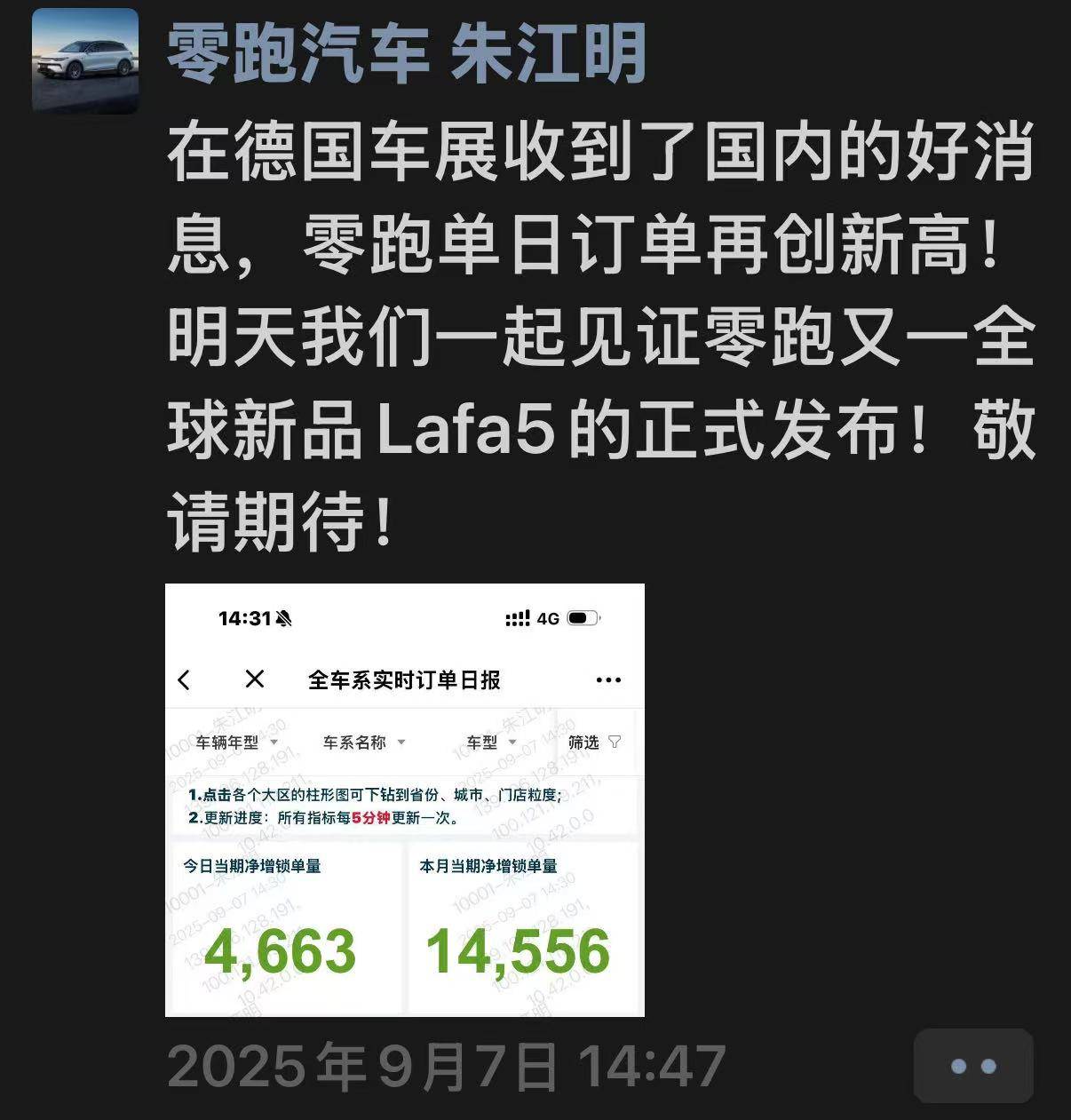 2025年8月,零跑汽車總銷量為57066輛,創(chuàng)下歷史新高,并已連續(xù)六個月位居新勢力品牌銷量榜首。9月剛過去一周,零跑的腳步還在加速——9月7日,朱江明發(fā)朋友圈表示“零跑單日訂單再創(chuàng)新高”,截圖顯示的內(nèi)部系統(tǒng)數(shù)據(jù)為: