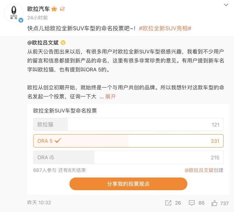 有意思的是,在此次申報圖中,歐拉這臺全新SUV有著“ORA 5”、“歐拉貓”兩種不同的尾部標識,結合歐拉品牌總經理呂文斌曾在25款好貓的上市發布會上表示,“下半年,歐拉汽車要推出斥資10億、耗時三年打造的兩款全球化重磅新品”,也就是說,歐拉這臺全新SUV大概率就是一臺全球化車型,個人猜測國內可能會以“歐拉5”命名。