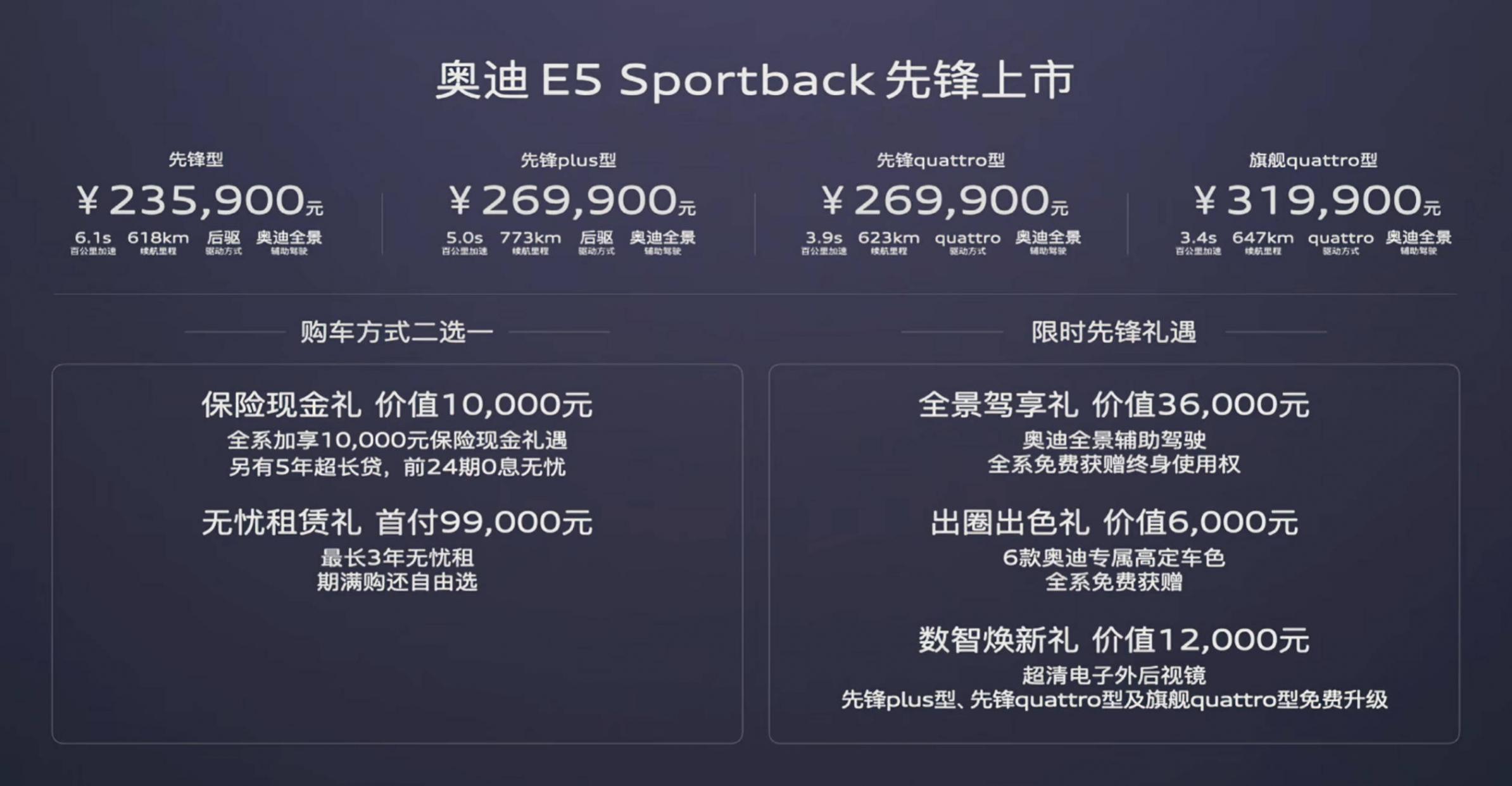 2025年9月16日,廣州,奧迪旗下首款全新豪華電動戰(zhàn)略車型——奧迪E5 Sportback正式上市,全系推出先鋒型、先鋒plus型、先鋒quattro型及旗艦quattro型4款配置,臻享價23.59萬元起,疊加萬元保險現(xiàn)金權(quán)益后,實際入手價進入22萬級區(qū)間,且上市即開啟交付,為追求高端電動出行的消費者帶來“即買即享”的便捷體驗。作為奧迪全新電動車設(shè)計語言在華的首發(fā)力作,該車融合德系精工與中國前沿數(shù)字創(chuàng)新,以先鋒美學(xué)、前瞻智能、極致駕控與精工品質(zhì),重新詮釋“突破科技·啟迪未來”的品牌精神,開啟智能豪華純電新紀(jì)元。