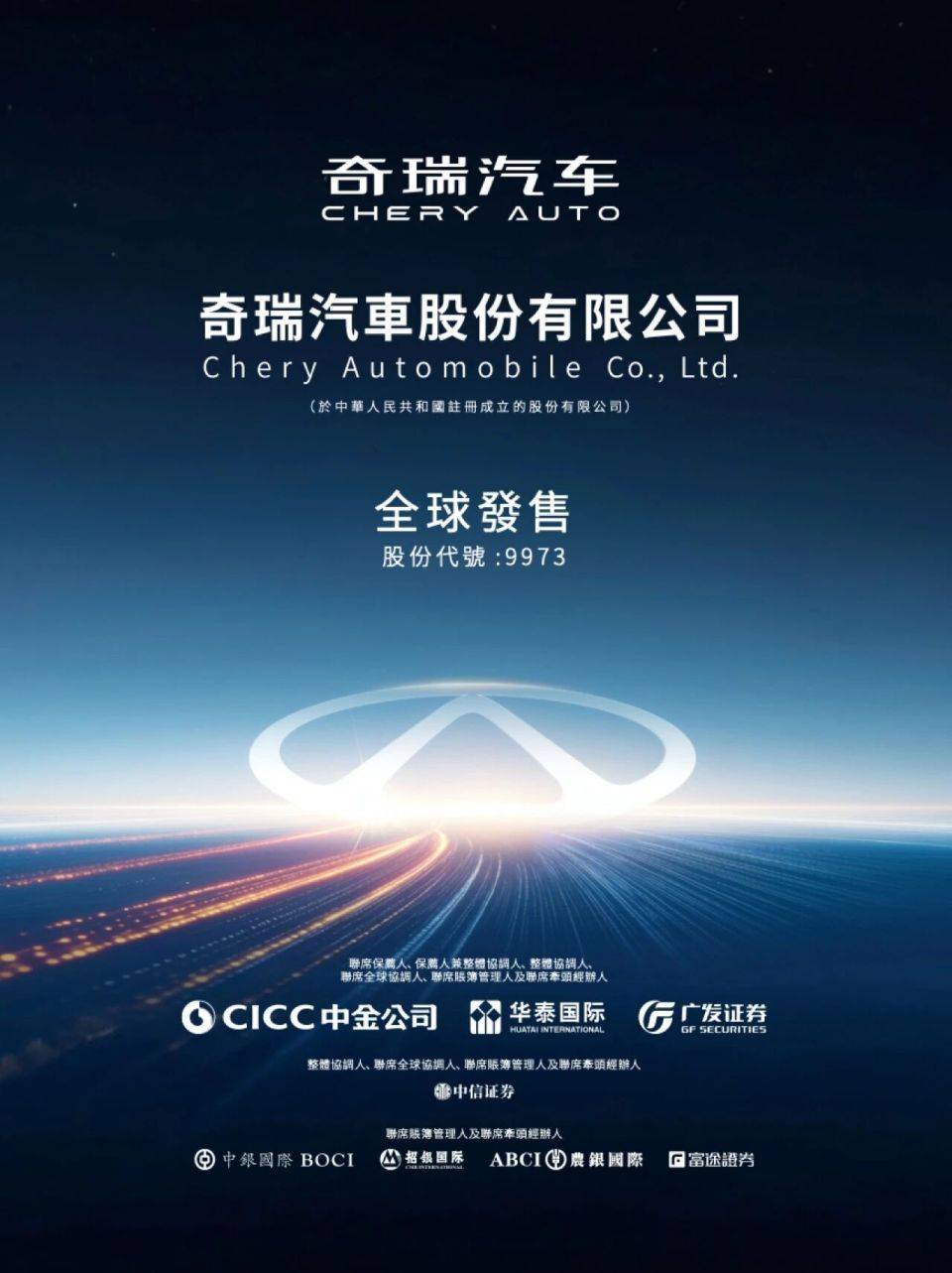 奇瑞汽車股份有限公司已于昨天(9月17日)正式啟動港股招股,計劃全球發售2.97億股H股,發行價格區間定為每股27.75至30.75港元。預計將于9月25日正式掛牌交易,股票代碼是09973。