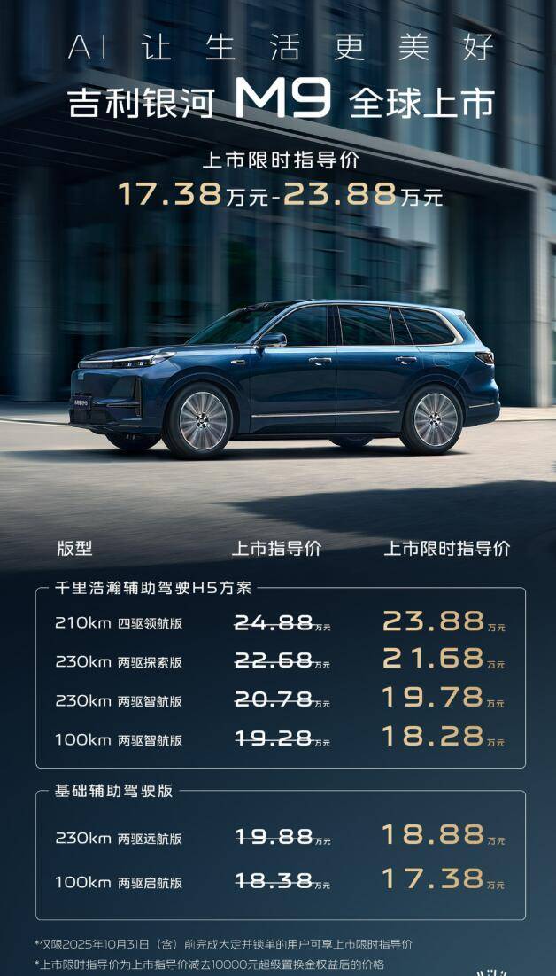 昨晚,車市的新車“大瓜”要數吉利銀河M9,這款全新中大型SUV正式發布上市,共推出6款配置,上市指導價區間為18.38-24.88萬元,上市限時指導價區間為17.38-23.88萬元。