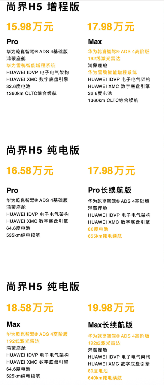從公布的信息來看,尚界H5定位5座SUV,分為純電、增程兩種動力形式。為了更精準切入目標用戶,尚界H5共分為6種版本,其中增程分為Pro、Max版本,均搭載32.6度電池,售價分別為15.98萬元、17.98萬元。