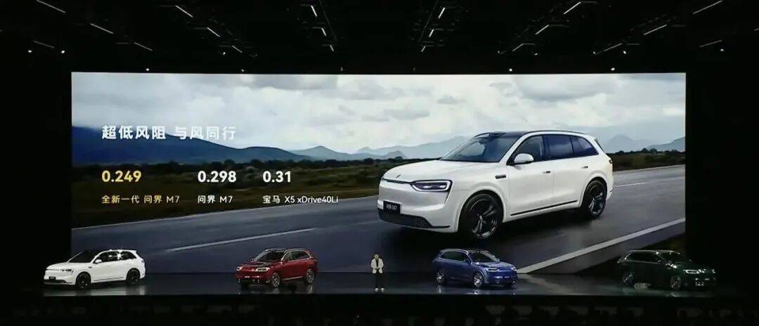 新問界M7整車尺寸更大,但其仍舊保持風阻系數為。通過下壓車頭,實現風阻系數0.249,而寶馬X5這一數字為0.31。