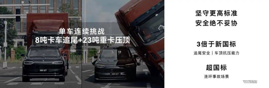 視頻測試顯示,新問界M7成功完成單車連續8噸卡車追尾與23噸重卡壓頂極限挑戰,追尾安全與車頂抗壓能力超新國標3倍。