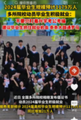 “2024屆全國普通高校畢業生預計1179萬人,同比增加21萬人,就業形勢比往年更加嚴峻。”