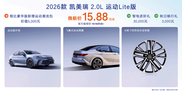 - 凱美瑞“增配不增價”,全球運動版造型下放,入門價15.88萬元起,智能安全配置進一步升級。