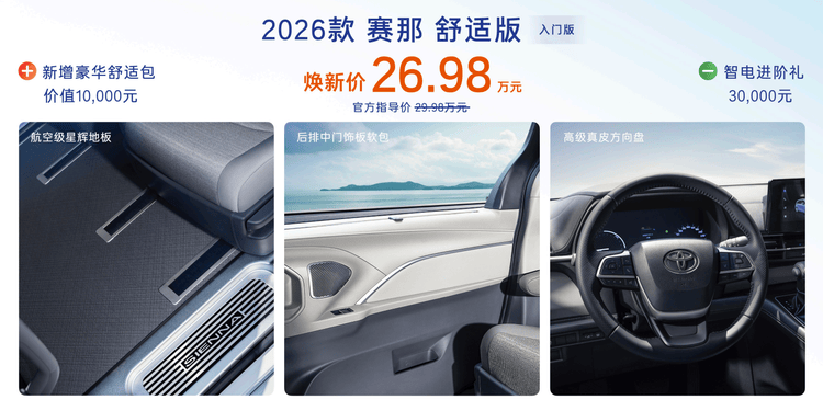 - 賽那主打“豪華不分級別”,入門價26.98萬元起。新增四驅臻享版(33.98萬元),配備雷克薩斯LM同款頭等艙座椅、E-FOUR電子四驅,靜謐性媲美豪車,實現“30萬級定價,百萬級體驗”。