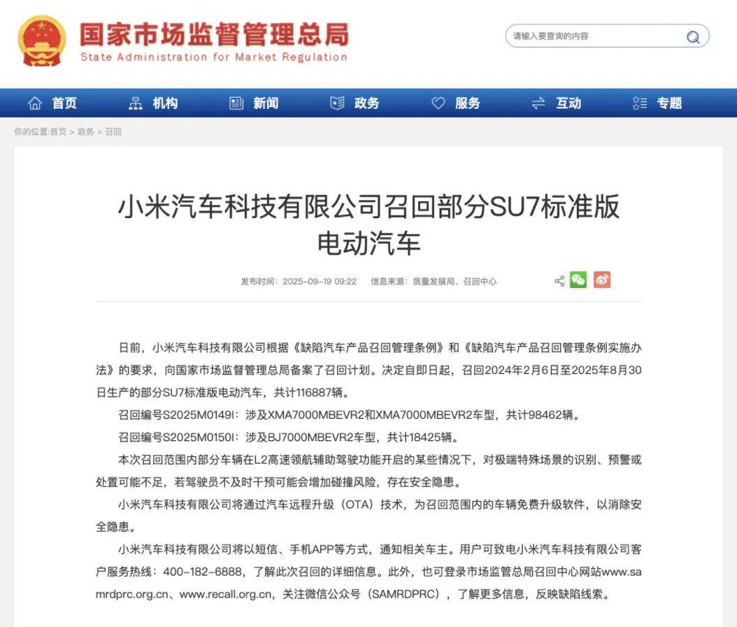 近日,市場監(jiān)管總局發(fā)布最新召回通告,涉及小米、小鵬、斯巴魯?shù)溶嚻蟆?/strong>其中,風頭較火的就屬“小米召回近11.7萬輛SU7”的事件,跟以往很多車企召回有很大不同,此次小米汽車的召回是由于存在安全缺陷被總局相關部門調(diào)查,最終導致的召回。