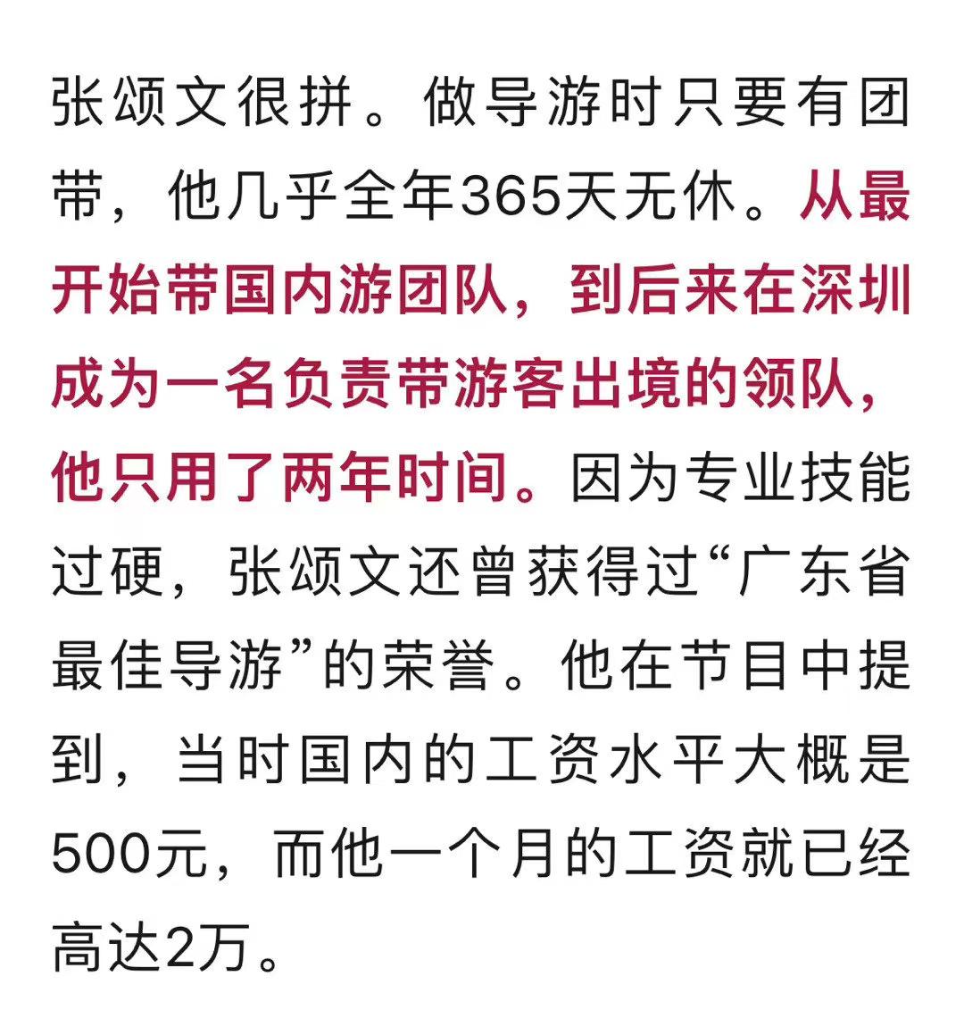 因為表現優異,張頌文還獲得過“廣東省最佳導游”的榮譽。他曾綜藝節目中透露過,當時國內工資的水平大概是每月500元,那時候他一個月的工資就已經高達2萬元。