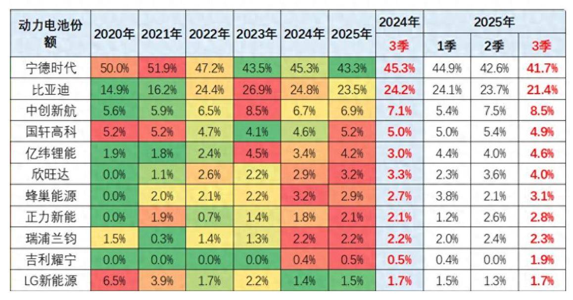 寧德時代曾一度占據中國動力電池市場半壁江山,“寧王”稱號由此得來。然而最新數據顯示,2025年第三季度,寧德時代在國內的市場份額已降至41.7%,創下五年新低。