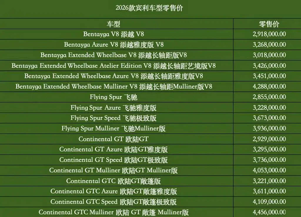 日前,2026款賓利車型正式上市,其中新款添越共有6款車型,售價區間291.8-428.8萬元;新款飛馳共有4款車型,售價區間285.5-393.6萬元;新款歐陸GT共有8款車型,售價區間292.9-445.6萬元。