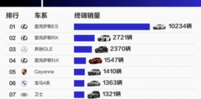除此之外,奔馳GLE售出了2370輛,寶馬4系是1363輛,而保時捷卡宴和帕拉梅拉分別為1410輛和1054輛,還有豐田埃爾法也售出652輛新車。如果從年度累計銷量看,雷克薩斯ES依然是銷冠,其次就是雷克薩斯RX和奔馳GLE。