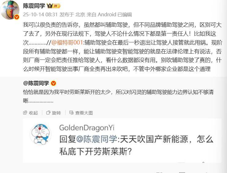 他坦言:“恰恰就是因為我平時勞斯萊斯開的太少,所以對閃靈的輔助駕駛能力邊界認知不夠清晰”。陳震進一步解釋,不同品牌的輔助駕駛系統(tǒng)存在顯著差異。他指出,事故中輔助駕駛系統(tǒng)在關鍵時刻選擇了“最后一秒退出”,將控制權交還給駕駛人。這種現(xiàn)象被一些用戶稱為“甩鍋”機制——系統(tǒng)在遇到無法處理的復雜場景時,會在最后一刻退出并要求人工接管,導致駕駛人沒有足夠時間做出反應。陳震強調:“在現(xiàn)行法規(guī)下,駕駛人不論什么情況下都是第一責任人!”目前法律框架下,無論輔助駕駛系統(tǒng)是否啟用,車輛操作的責任主體始終是駕駛人。這一規(guī)定使得在類似事故中,責任認定明確指向駕駛人而非廠商。