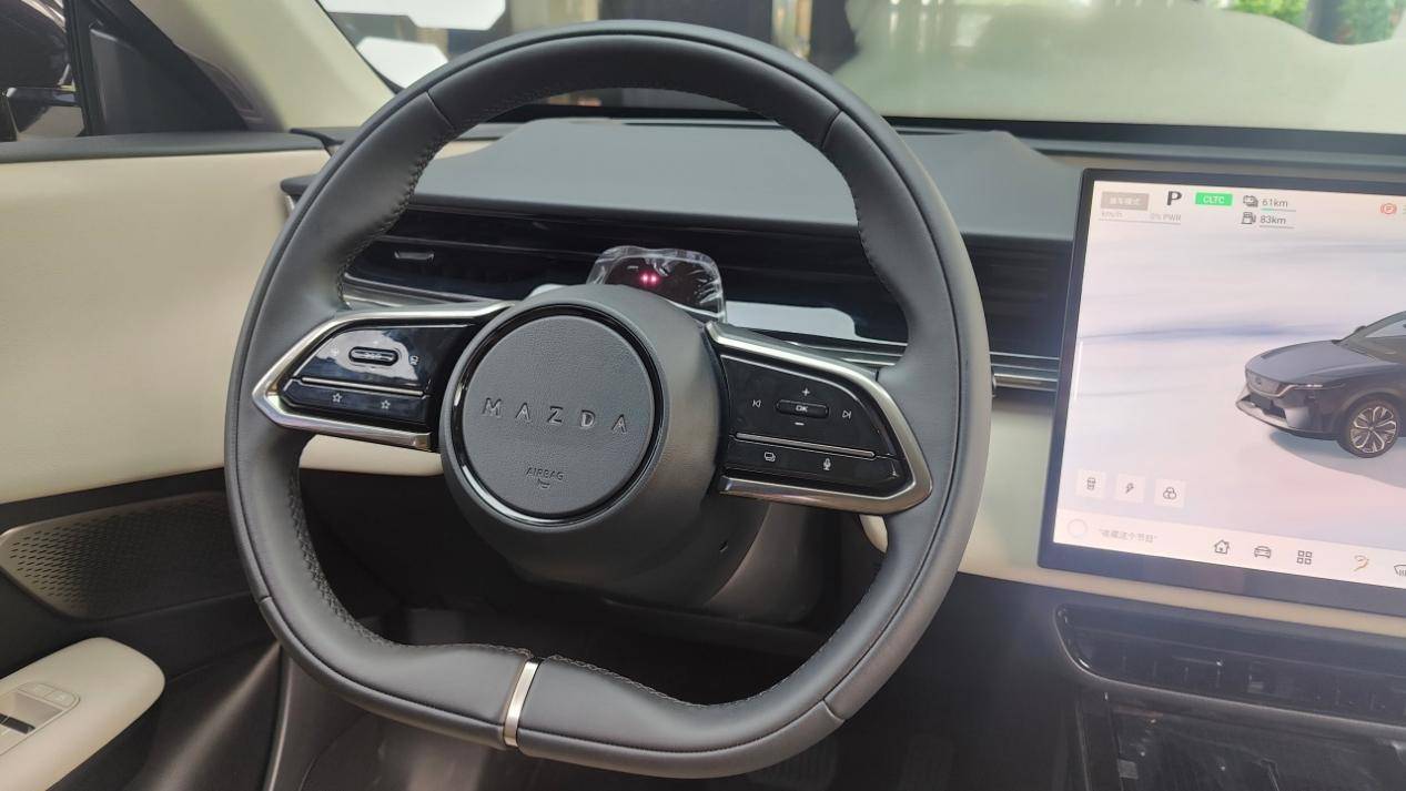 轉向的精準度不錯,虛位很小,而且阻尼隨角度的變化很順暢,但不同駕駛模式之間的差別不太明顯,同時手感也沒有傳統的燃油馬自達那么重,路感反饋清晰度一般,電子味較明顯,但比EZ-6更自然。