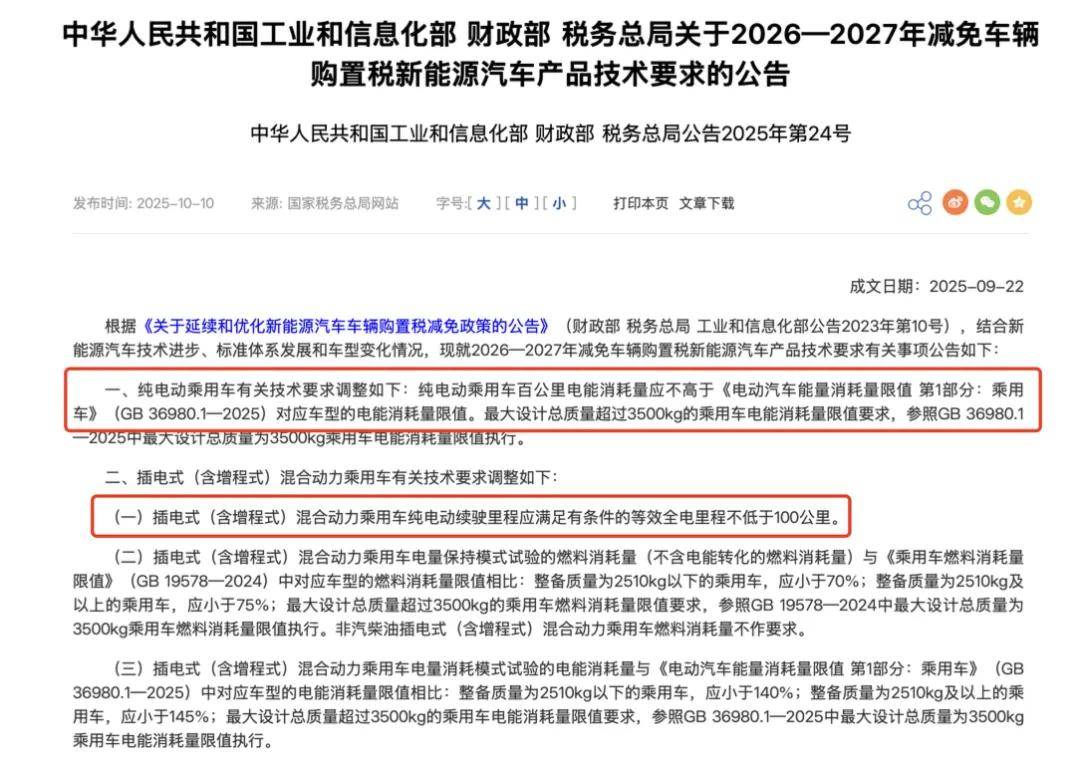 另外,前幾天上頭還發(fā)了新的公告,對(duì)2026—2027年減免車(chē)輛購(gòu)置稅的新能源車(chē)也做出了技術(shù)要求,核心就兩條:
