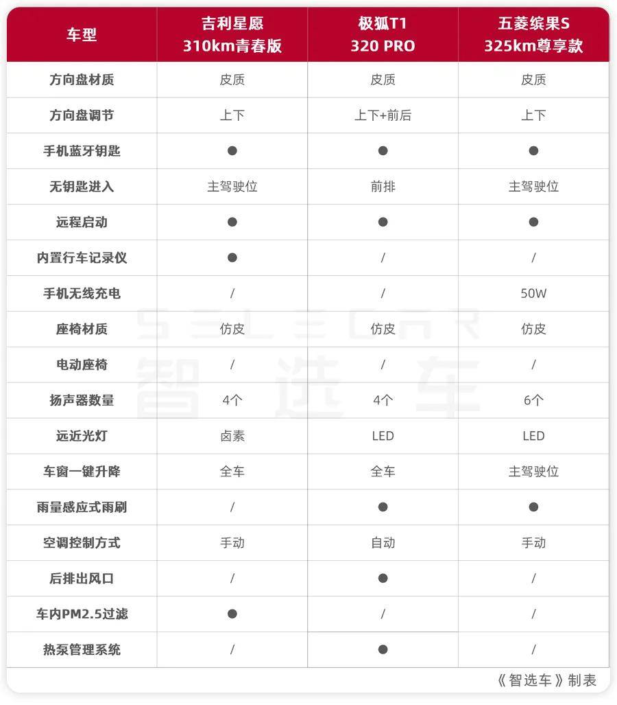 動力方面,極狐T1在低配車型上反而搭載了95kW的大功率電機(jī),五菱繽果S的電機(jī)功率中規(guī)中矩,吉利星愿的電機(jī)功率則最小。