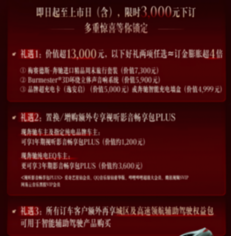 首批預售權益包括總價可超1.3萬元的大禮包,其中包括旅行套裝、Burmester®?3D環繞立體聲音響系統和品牌超充卡或奔馳官方智能充電墻盒等,除此之外,上市前任意時間下訂的用戶,還可額外再享城區及高速領航輔助駕駛權益包,該權益可用于智能輔助駕駛產品的購買。
