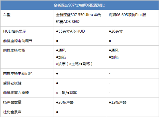 而在配置上,我們直接把兩臺車配置拉到頂來對比一下。兩車的配置水平都挺不錯,前排座椅通風加熱都具備,不過全新深藍S07配備了雙零重力座椅、邁巴赫級的20揚聲器杜比全景聲、55英寸AR-HUD、冷暖冰箱、負氧水離子空調等豪華配置,靠背還是石墨烯加熱!整體在舒適性配置上要比海獅06更好,無論是打工人的午休回血,還是旅途路上的兩人小憩都能舒舒服服的。