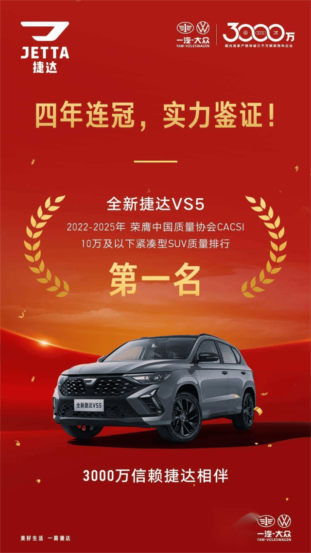 在由中國質量協會發布的汽車用戶滿意度測評(CACSI)中,自2022年起連續四年榮獲“10萬及以下緊湊型SUV”用戶滿意度第一名,彰顯了其卓越的產品力;同時,捷達VA3和VS7等車型也多次在各自細分市場獲得用戶滿意度第一,成為了520萬車主奮斗路上最忠實的伙伴。它見證了中國汽車市場的蓬勃發展,也參與了中國普通家庭從“擁有一輛車”到“享受有車生活”的時代變遷。正是這一份份沉甸甸的信賴,共同構筑了一汽-大眾邁向3000萬輛殿堂的堅實基石。
