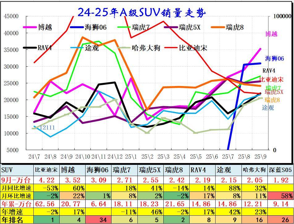 主流SUV市場格局迅速變化,比亞迪和吉利、長安、奇瑞的SUV 表現超強,實現了自主SUV的國內外全面突破。