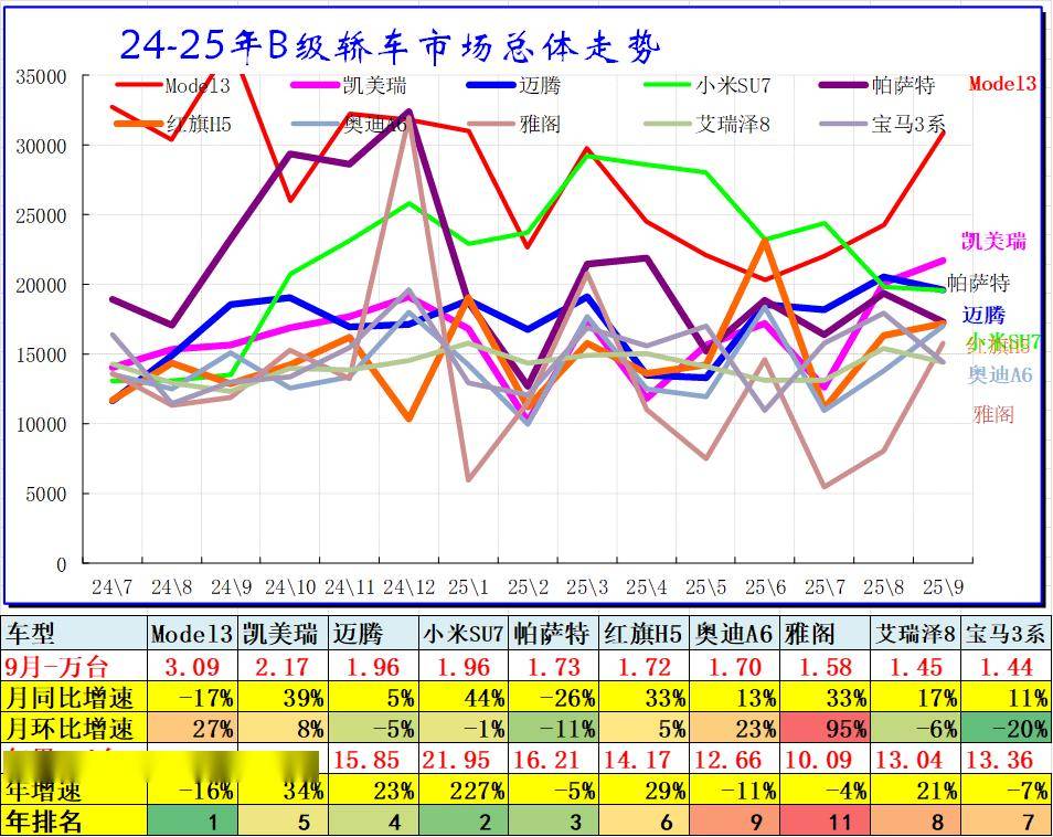 B級轎車2025年9月批發36.73萬臺,占批發份額32.54%,批發較去年同期同比增長8%,批發環比今年上月增長6%;2025年9月零售較去年同期同比增長8%,零售環比今年上月增長8%。2025年1-9月批發數量290.38萬臺,廠家批發銷售累計增幅6%;2025年1-9月國內零售數量269.6萬臺,零售累計增幅9%。