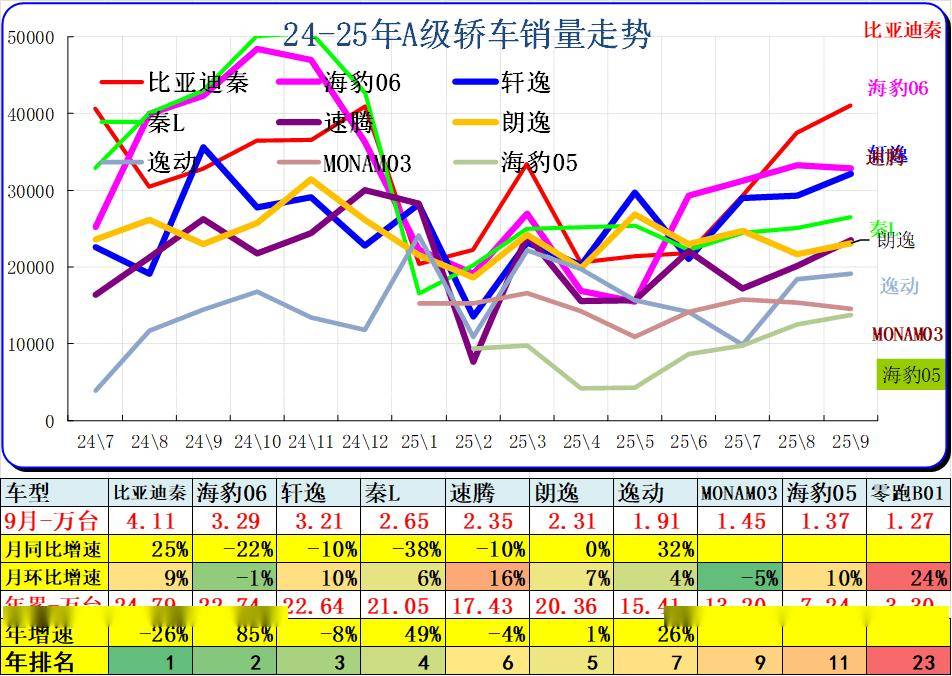 A00級轎車2025年9月批發15.13萬臺,占批發份額13.4%,批發較去年同期同比增長12%,批發環比今年上月增長28%;2025年9月零售較去年同期同比增長2%,零售環比今年上月增長34%。2025年1-9月批發數量120.93萬臺,廠家批發銷售累計增幅59%;2025年1-9月國內零售數量98.59萬臺,零售累計增幅26%。