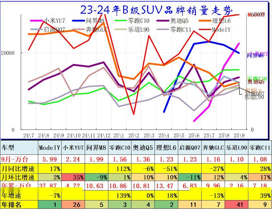 B級SUV 2025年9月批發41.59萬臺,占批發份額26.64%,批發較去年同期同比增長10%,批發環比今年上月增長17%;2025年9月零售較去年同期同比增長4%,零售環比今年上月增長17%。2025年1-9月批發數量280.63萬臺,廠家批發銷售累計增幅5%;2025年1-9月國內零售數量241.22萬臺,零售累計增幅3%。