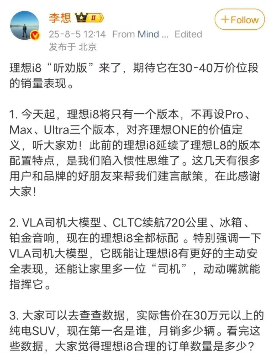 或許是之前太順了,面對增程賽道大批“半價理想”的貼臉開大,理想沒有予以重視,仍自信地認為全新純電SUV產品能帶來第二增長曲線,結果被現實狠狠打臉:i8定價超出消費者預期,導致訂單啞火,后續企業緊急調價,回歸單一配置,也無法彌補首發失利的影響。