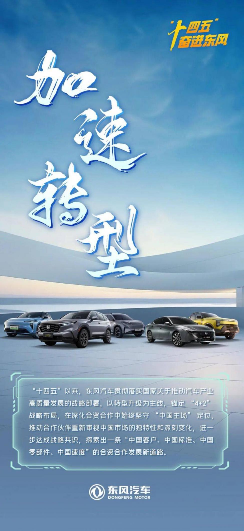 “十四五” 以來,東風汽車貫徹落實國家關于推動汽車產業高質量發展的戰略部署,以轉型升級為主線,錨定 “4+2” 戰略布局,在深化合資合作中始終堅守 “中國主場” 定位,推動合作伙伴重新審視中國市場的獨特性和深刻變化,進一步鞏固戰略共識,探索出一條“中國客戶、中國標準、中國零部件、中國速度”的合資合作發展新道路。