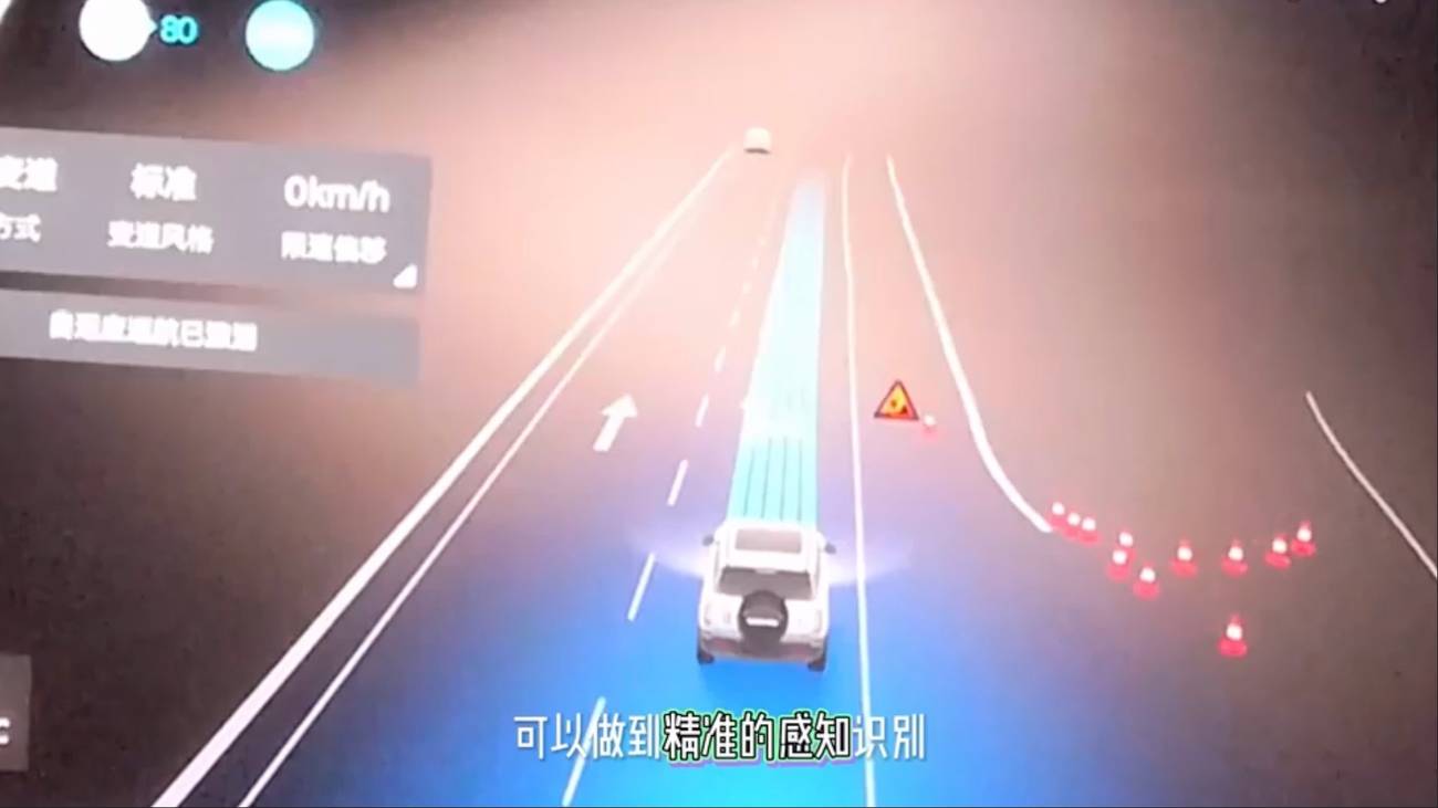 激光雷達與攝像頭的協同工作,在這個場景中發揮了關鍵作用。在經過高速維修路段是,系統還成功識別出了路面上擺放的警示牌等非標準障礙物,并主動減速發起避讓動作,關鍵時刻會提醒駕駛員注意接管車輛,并不會強行逞能嘗試風險通過。
