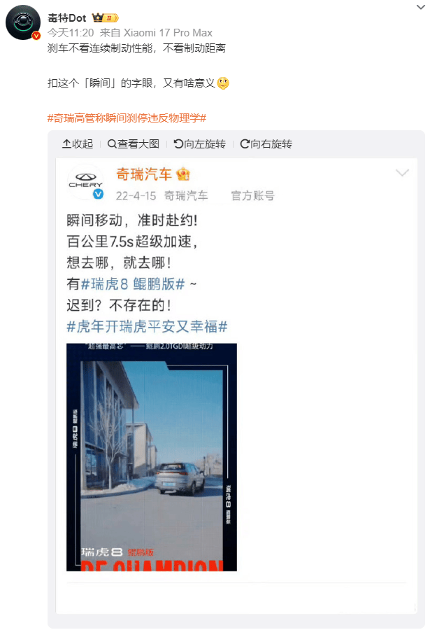 于是一個ID名為“毒特Dot”的網(wǎng)友搬出了一張奇瑞汽車于2022年4月15日發(fā)布的海報,其中使用了“瞬間移動,準時赴約!百公里加速7.5秒超級加速”的描述。