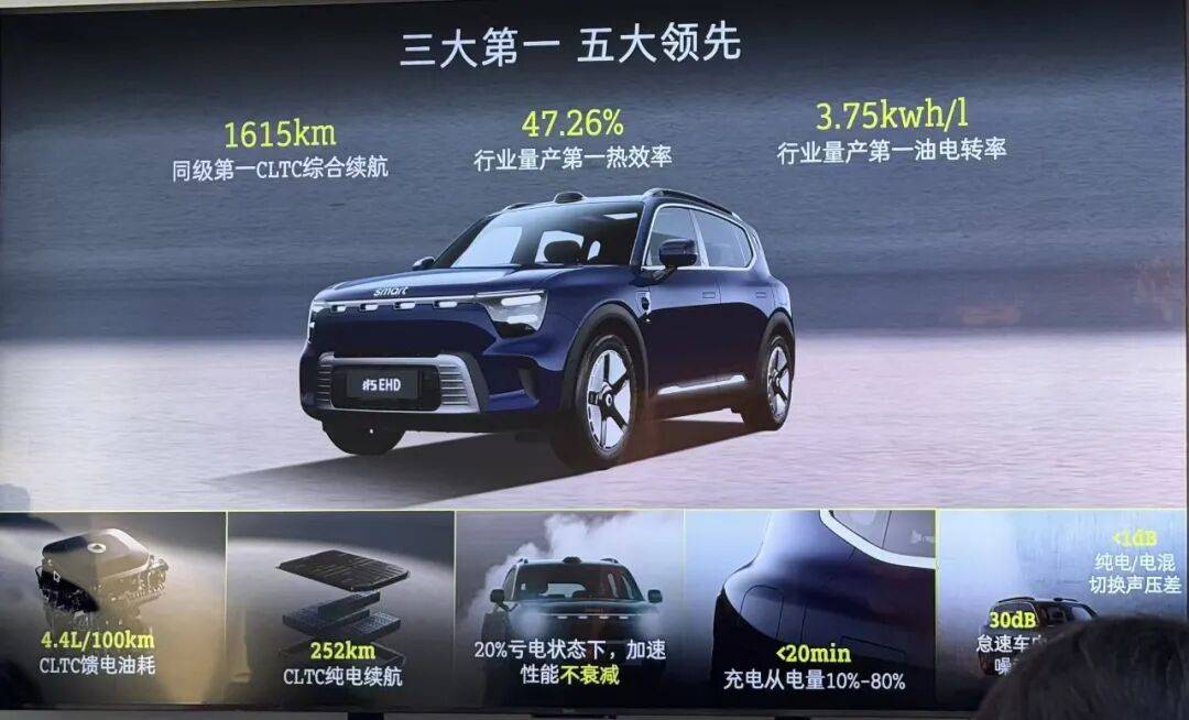 比如最新推出的smart#5 精靈5號所搭載的EHD超級電混系統,跟吉利旗下高端品牌領克和極氪就屬“同根同源”。這套行業領先的雷神電混2.0系統,讓精靈5號新車CLTC綜合續航實現1615km,熱效率高達47.26%,達到當前行業量產發動機的最高水平。