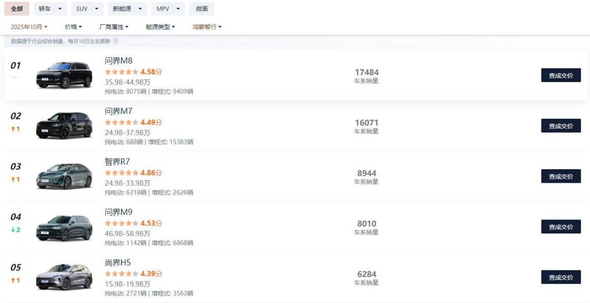 銷量層面,目前我們還未拿到這10款車型在11月份的具體交付數字,但基于10月的銷量數據我們基本可以判斷到,排在銷量前五位的車型應該是問界M8/M7、智界R7、問界M9以及尚界H5這5款。