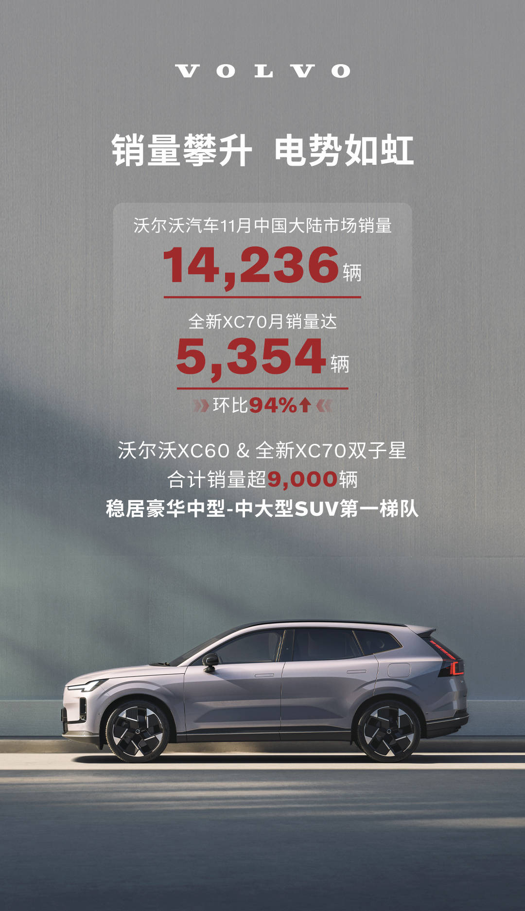 另外,沃爾沃XC60的銷量也不錯,雙子星合力,在11月合計賣了9000臺,使得沃爾沃的銷量新能源車占比已經43%,實力強勁。