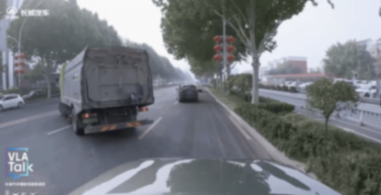 比如直播中,測試車輛前方突然出現(xiàn)了不打燈加塞的社會車輛,系統(tǒng)隨即開啟防御性駕駛,保持自然車距。吳會肖表示,防御性駕駛的目的是讓系統(tǒng)學(xué)會害怕,這是長城VLA最核心的價值和意義。