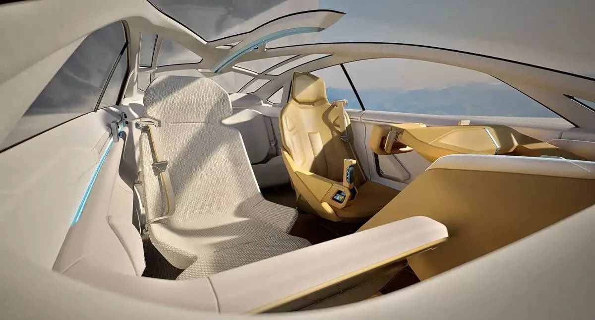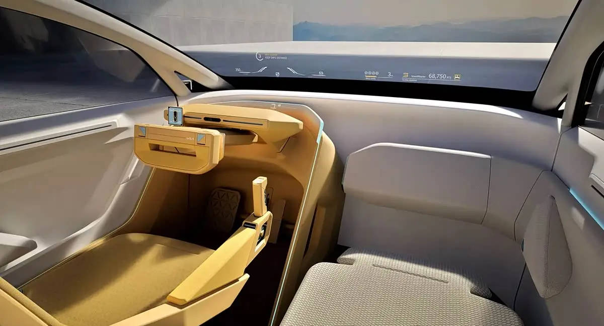 內(nèi)飾上,新車提供極速者、夢想家、游戲玩家三種模式,經(jīng)由增強(qiáng)現(xiàn)實(shí)抬頭顯示功能將以上三種元素投射到風(fēng)擋上。同時(shí)該車方向盤和手柄的設(shè)計(jì)也比較科幻,,方向盤上方還有一個(gè)小的屏幕,環(huán)抱式的主駕席前方也有儀表顯示和面部監(jiān)測系統(tǒng)。主駕和副駕的座椅顏色與材質(zhì)分割開來,展現(xiàn)不同的視覺。