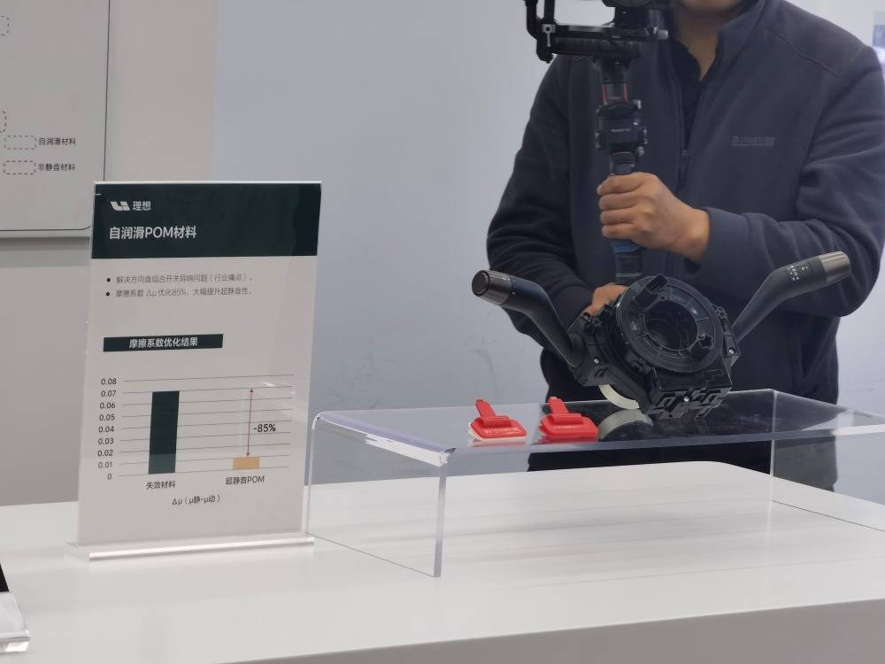 圖中是理想汽車應(yīng)用在方向盤組合開關(guān)上的的自潤滑POM材料,可以解決方向盤組合開關(guān)異響的問題,摩擦系數(shù)大幅優(yōu)化,提升靜音性。