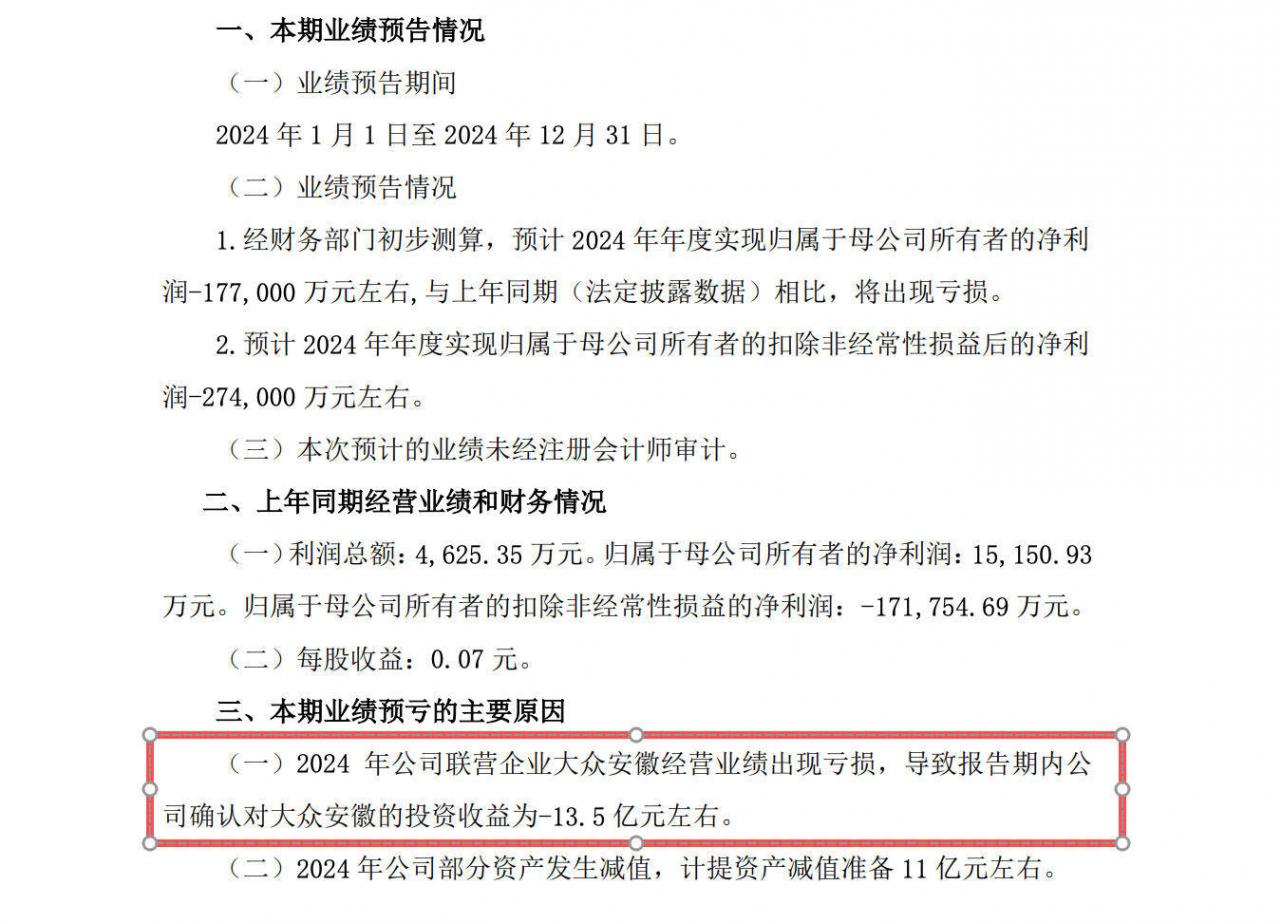 根據(jù)江淮汽車(600418.SH)2024年年度業(yè)績預虧公告,公司2024年年度由盈轉(zhuǎn)虧,虧損主要原因之一是2024年公司聯(lián)營企業(yè)大眾安徽經(jīng)營業(yè)績出現(xiàn)虧損,導致報告期內(nèi)公司確認對大眾安徽的投資收益為-13.5億元左右。
