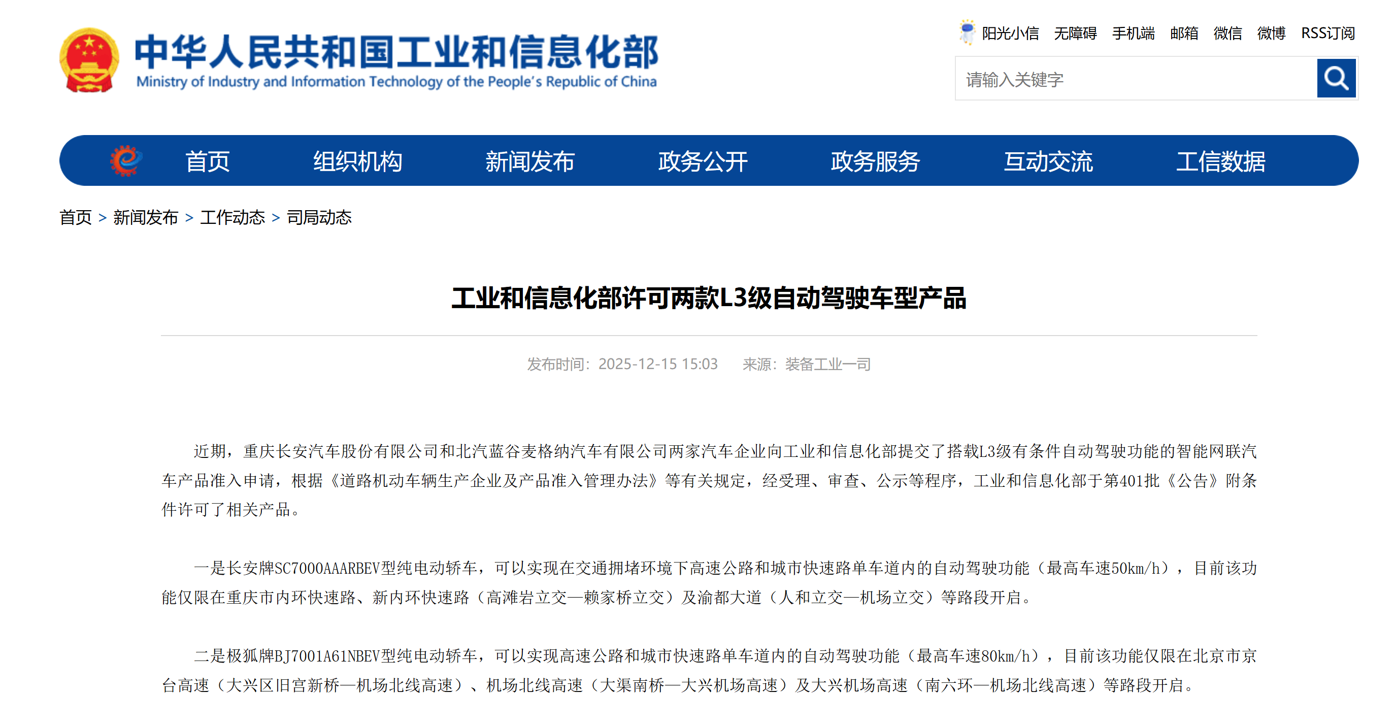 工業(yè)和信息化部于12月15日正式附條件許可了兩款L3級有條件自動駕駛車型產(chǎn)品準入,標志著我國智能網(wǎng)聯(lián)汽車從“技術驗證”邁入“量產(chǎn)應用”新階段。