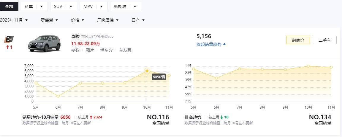 目前國內市場在售的現款奇駿大部分都是奇駿·榮譽車型,終端價格也已經來到了十二三萬,主打的那叫一個量大管飽,能更好地照顧到那些對于大空間有需求的家用消費者。從銷量上來看,奇駿在11月份賣出去了5156輛新車,屬于是東風日產旗下第三熱銷的車型,整體表現還算尚可。