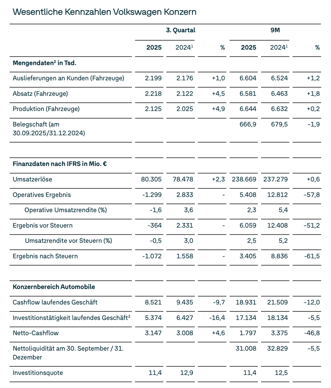 10月30日,大眾汽車集團發(fā)布2025年第三季度財報顯示,2025年第三季度實現(xiàn)營業(yè)收入803.05億歐元,同比增長2.3%;營業(yè)虧損12.99億歐元,上年同期營業(yè)利潤28.33億歐元;息稅前利潤為虧損3.64億歐元,同期利潤為23.31億歐元;稅后利潤為虧損10.72億歐元,同期為15.58億歐元。從數(shù)據(jù)不難看出,雖然大眾汽車營收實現(xiàn)增長,但是卻在盈利方面面臨巨大的嚴峻挑戰(zhàn)。