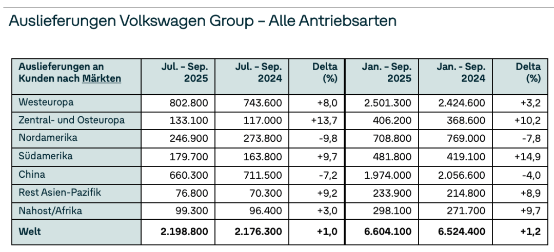 2025年第三季度,大眾汽車集團共交付汽車219.9萬輛,同比增長1.0%。從增長動力來看,部分具體車型在全球市場表現(xiàn)出色,為交付量增長做出了貢獻。不過,這樣的增長幅度在全球汽車市場快速發(fā)展的當下,顯得有些不盡人意。中國作為大眾汽車的重要市場,曾經(jīng)為其全球銷量增長提供強大動力,但如今情況卻不容樂觀。第三季度,大眾汽車在中國市場的銷量出現(xiàn)下滑,同比下滑7.2%,為66.03萬輛。隨著中國自主品牌車企如比亞迪、奇瑞、吉利等的強勢崛起,市場競爭異常激烈。自主品牌在新能源汽車領域憑借性價比優(yōu)勢、先進的電池技術和智能化配置,迅速搶占市場份額。大眾汽車在面對這些競爭對手時,在產(chǎn)品價格、智能化水平等方面的優(yōu)勢不再明顯,導致其市場份額被逐步擠壓。