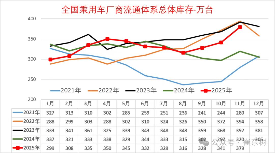 由于旺季不旺,11月全國乘用車庫存回升至379萬輛(乘聯(lián)分會數(shù)據(jù)),預估可支撐未來銷售61天,比去年同期的數(shù)字多13天。