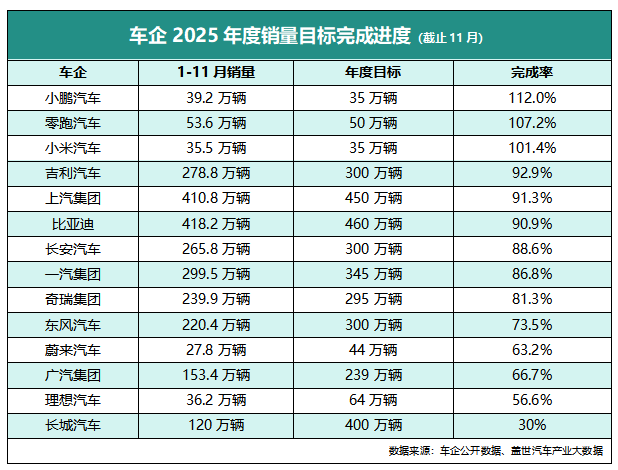 直接體現(xiàn)這股寒意的是車企2025年度銷量目標的完成進度條。根據(jù)公開數(shù)據(jù),截至11月,國內14家主流車企尚有8家年度目標完成率不足90%,尤其是長城、理想、廣汽、蔚來、東風這5家車企,任務完成率都在80%以下,曾經領跑汽車新勢力的蔚來、理想前11個月分別只完成27.8萬輛和36.2萬輛的銷量,目標完成率僅63.2%和56.6%。