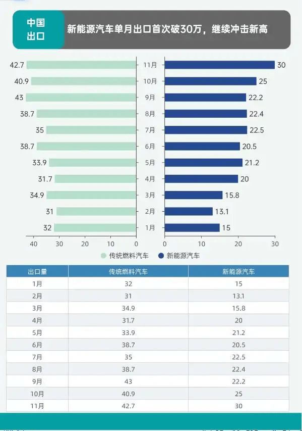出口數(shù)據(jù)也相當可觀。今年前11個月,中國汽車出口634.3萬輛,同比增長18.7%,其中新能源汽車出口231.5萬輛,同比增長翻倍。