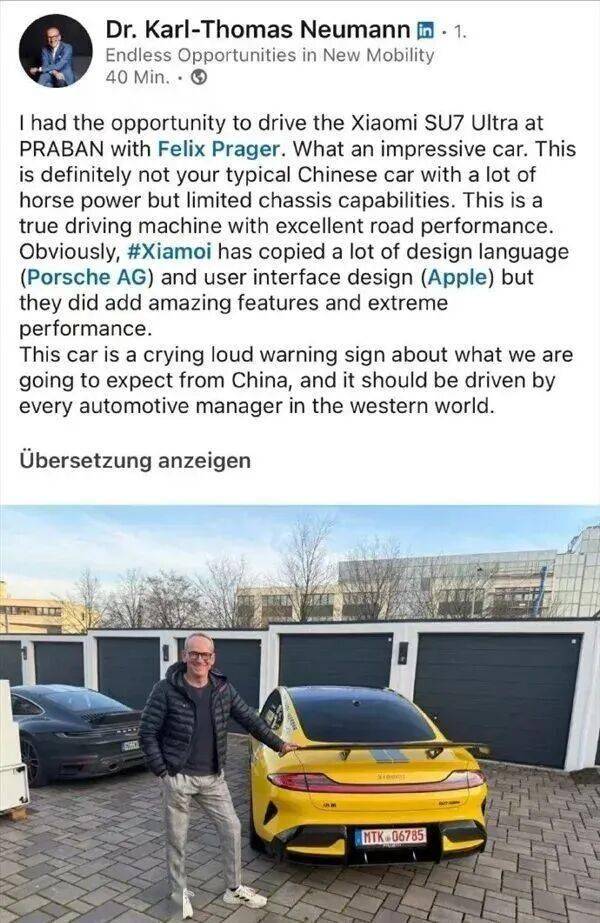 紐曼的試駕體驗源自一次偶然機會。他將小米SU7 Ultra定義為“一個響亮的警告信號”,并直言不諱地表示:“西方每一位汽車經理都應該試駕一下”。這位曾掌舵大眾中國業務的行業領袖,對小米在借鑒與創新之間的平衡給予了客觀評價:“顯然,小米借鑒了很多設計語言(保時捷)和用戶界面設計(蘋果),但他們確實帶來了驚人的功能和極致的性能。”紐曼的評價特別強調了小米SU7在底盤操控方面的卓越表現,突破了海外工程師對中國車“堆配置但缺操控”的刻板印象。他的觀點在德國汽車圈并非個案。據報道,多位德國高端客戶在私下試駕后都表達了購買意向,但因“忌諱公開吹中國車”而保持沉默。